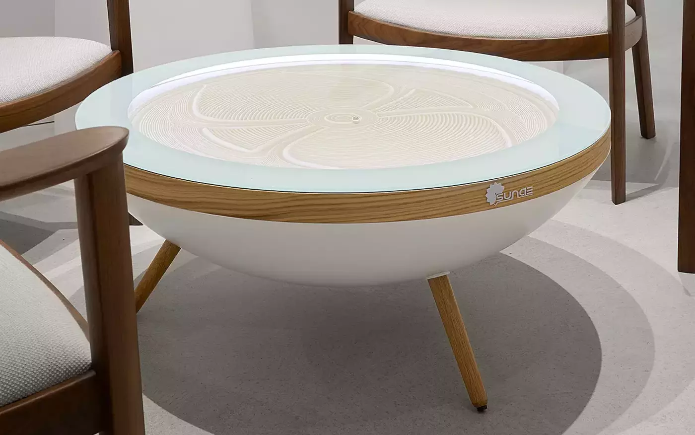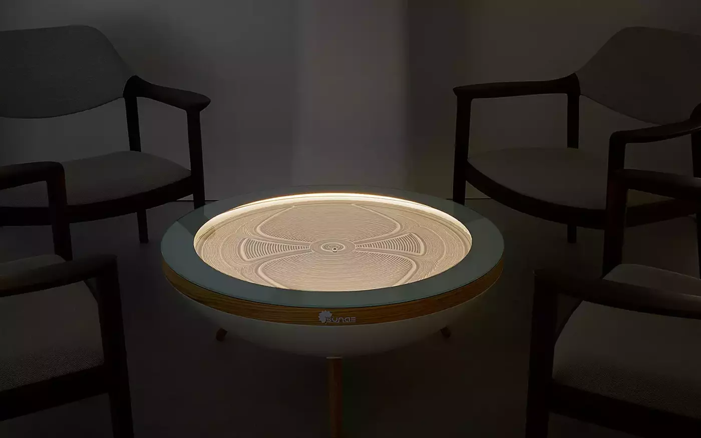 The Sunae sand table brings the Japanese Zen Garden directly into the home with a coffee table featuring a Zen Garden underneath its glass surface. The rake has been replaced by an intuitive mobile app that allows you to create a myriad of designs. Just one click and a metal ball traces lines through the sand in a mesmerizing way. Whether you enjoy watching new designs take form or prefer to contemplate the result, the Sunae table is both soothing and calming for the mind. Each Sunae table is meticulously handcrafted and assembled in Switzerland.