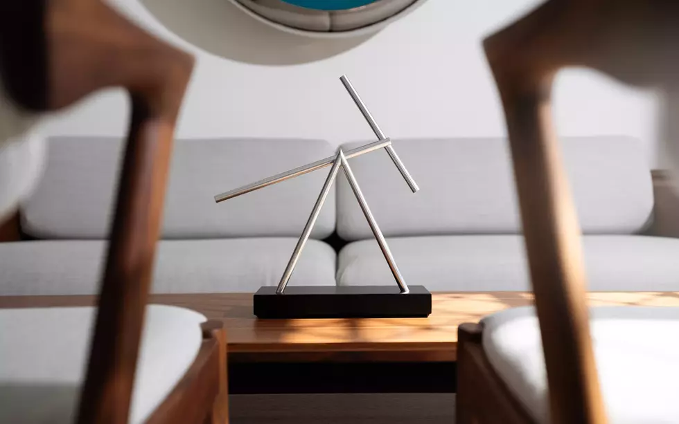 This sculpture elegantly embodies both simplicity and innovation. Through clever use of magnetic force, "The Swinging Sticks™" continues to swing continuously for up to two years without losing grace or flow of movement.