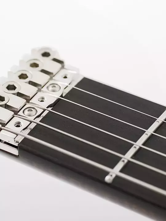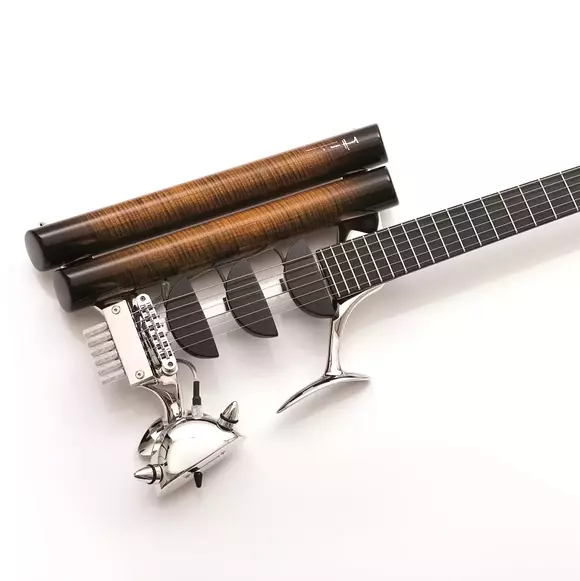 The body consists of two tonebars that are screwed onto the central elements "bird" and "fish". The neck is bolted onto the upper "bird" element, while the lower "fish" element carries the control box containing the guitar electronics. A rail between the "bird" and "fish" holds the slideable pickups. All three pickups can be exchanged with each other in seconds.