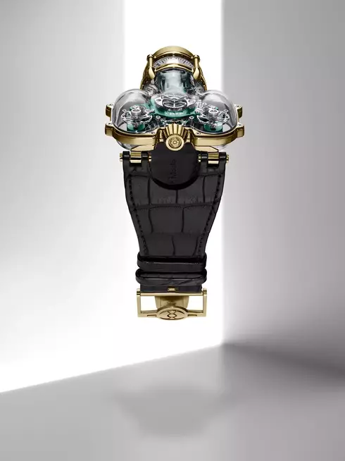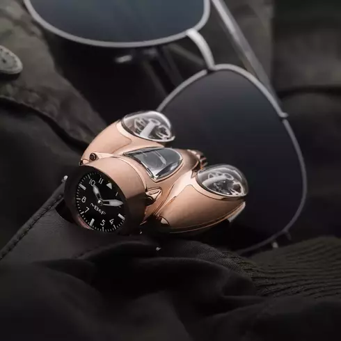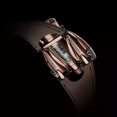 Inspired by the dynamic profiles of automotive and aviation mid-century design, HM9 Flow treads the path opened by the HM4 Thunderbolt and HM6 Space Pirate, with a geometrically complex combination of sapphire crystal, titanium and gold case elements. But HM9 goes beyond its predecessors, redefining what was thought to be possible in case design.