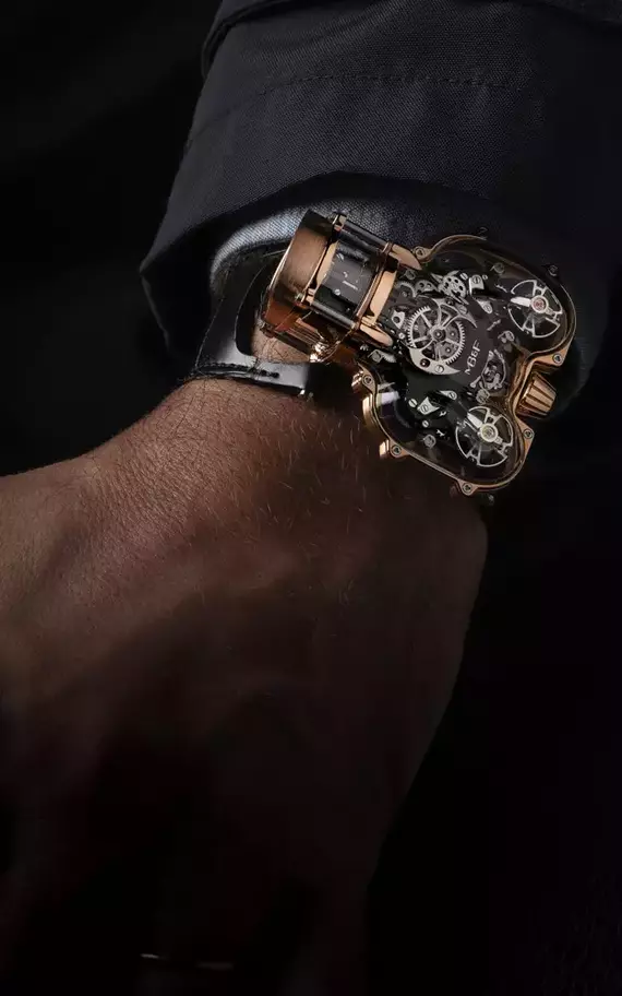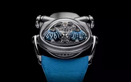 Reminiscent of a jet engine, the highly complex case encloses an equally complex in-house movement. Twin balance wheels beat independently on each flank of the Machine, while the central body reveals the gearbox of the HM9 engine: a planetary differential that averages the output of both balances to provide one stable reading of the time.