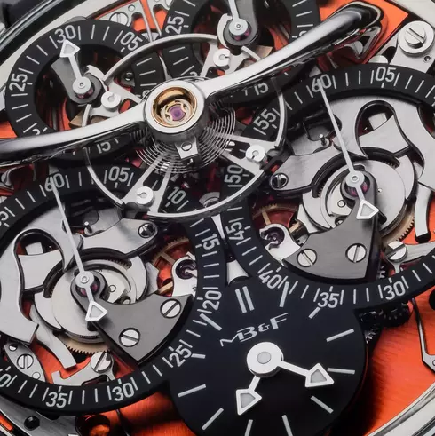 - Fully integrated dual chronograph system developed for MB&F by Stephen McDonnell, featuring Twinverter switch allowing multiple timing modes