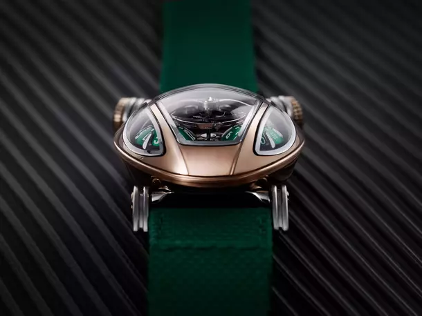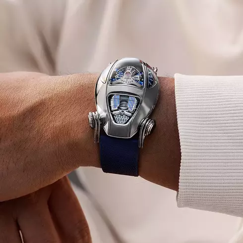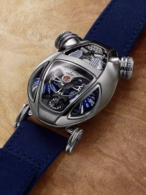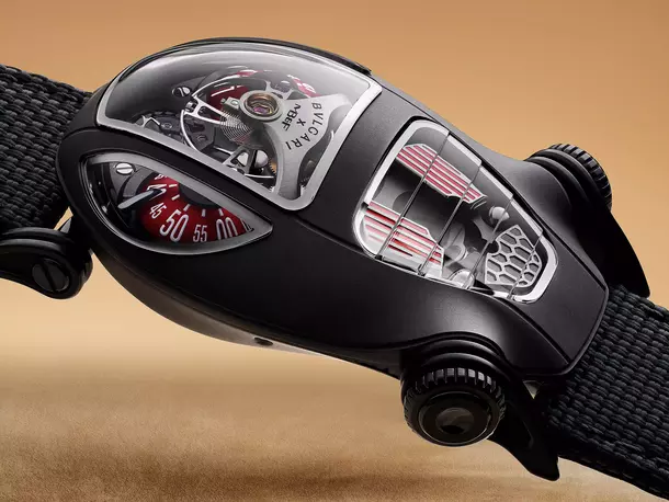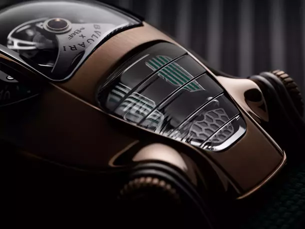 In addition to its obvious Serpenti origins, this unique new series reveals another source of inspiration for its two creators. Both Fabrizio and Max are car design enthusiasts and grew up with the same automotive references. Initially, there was no plan to incorporate automobile design codes into the Bvlgari x MB&F Serpenti, but there is no denying the influence that has seeped into this new creation: a case that resembles sleek automotive bodywork, a complex “stepped” sapphire crystal shaped like the flaps on the rear window of a sports car, crowns that could easily be mistaken for car wheels... The apparent portion of the movement also includes car engine-like components, including a grille with the famous hexagonal scale motif seen on previous Serpenti creations.