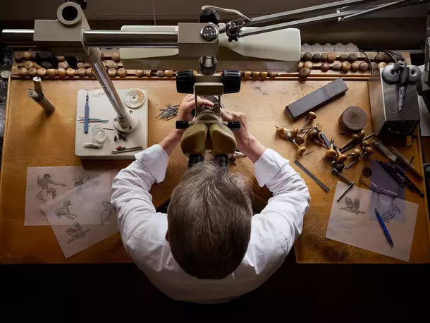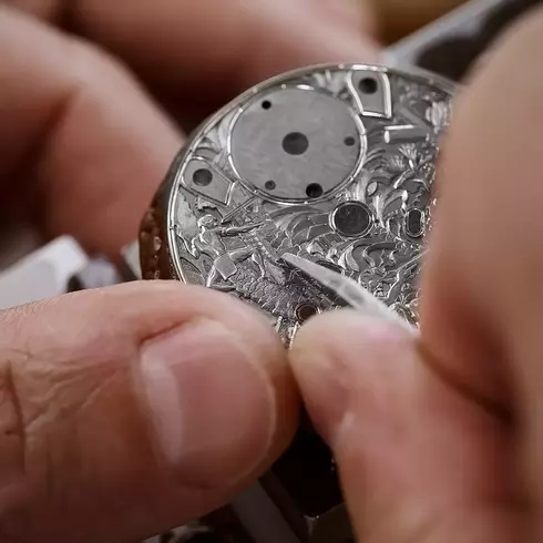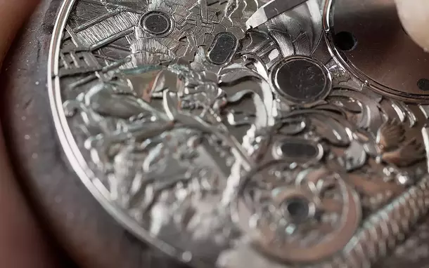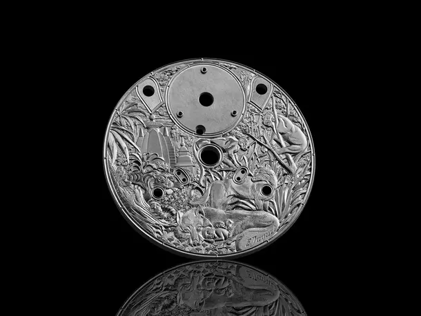 Not all the challenges of the pieces can be perceived with the naked eye. In certain parts, the dial plate had a thickness of 1.15mm, which allowed Jaquet ample space to engrave even in deep relief. In three particularly vulnerable areas, the dial plate measured only 0.35mm thick, requiring him to work with an extremely light touch in those places while making sure that the overall aesthetic of the engraving, which is intricately detailed, was not compromised.