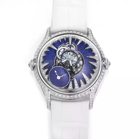 The first model, called Ice, features asymmetrical diamond-set stalagmites that encroach on the sapphire crystal dome and the movement. Each icy stalagmite is different, replicating the randomness of nature. Tarpin took his inspiration from a trip to Lake Baïkal in Southern Siberia, where in winter the lake freezes from the edge inwards until it is totally frozen. The claws of the diamond stalagmites have not quite claimed the movement and the matt lapis lazuli dial, leaving the beauty of the mechanism and the time visible to the eye.