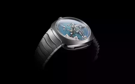 For the second model, named Blizzard, Tarpin let his imagination run free into the Alps where he has been skiing since he was two years old. He has interpreted memories of being caught in blizzards of snow into the LM FlyingT with brilliant-cut diamonds set under the sapphire crystal dome and closed-set diamonds set into the matt lapis lazuli dial, depicting snowflakes on the ground. The result is like a snow globe in motion.
