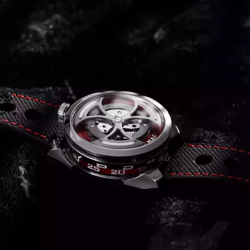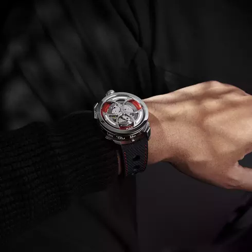 The M.A.D.1 RED is built on the same platform as the original M.A.D.1, with the same innovative case structure. It has the same lateral time display, featuring two rotating cylinders for the hours and minutes.