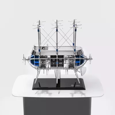 The clock’s technical specifications are impressive: 1520 components, 17kg, 60cm long by 60cm high and 35cm wide. The aircraft springs into action as the clock strikes the hours and prepares for take-off with its 32 rotating propellers that whirl for about seven seconds.