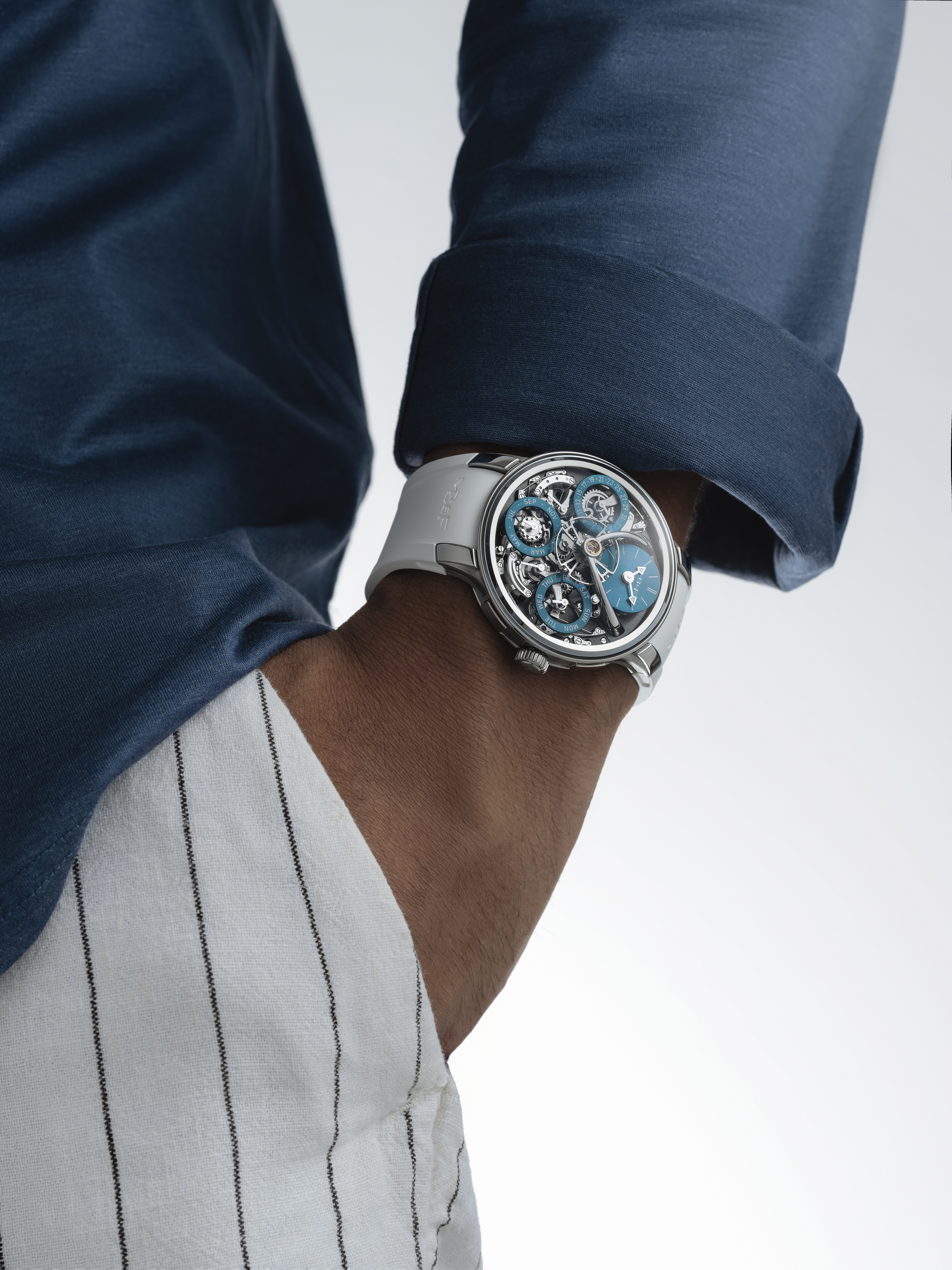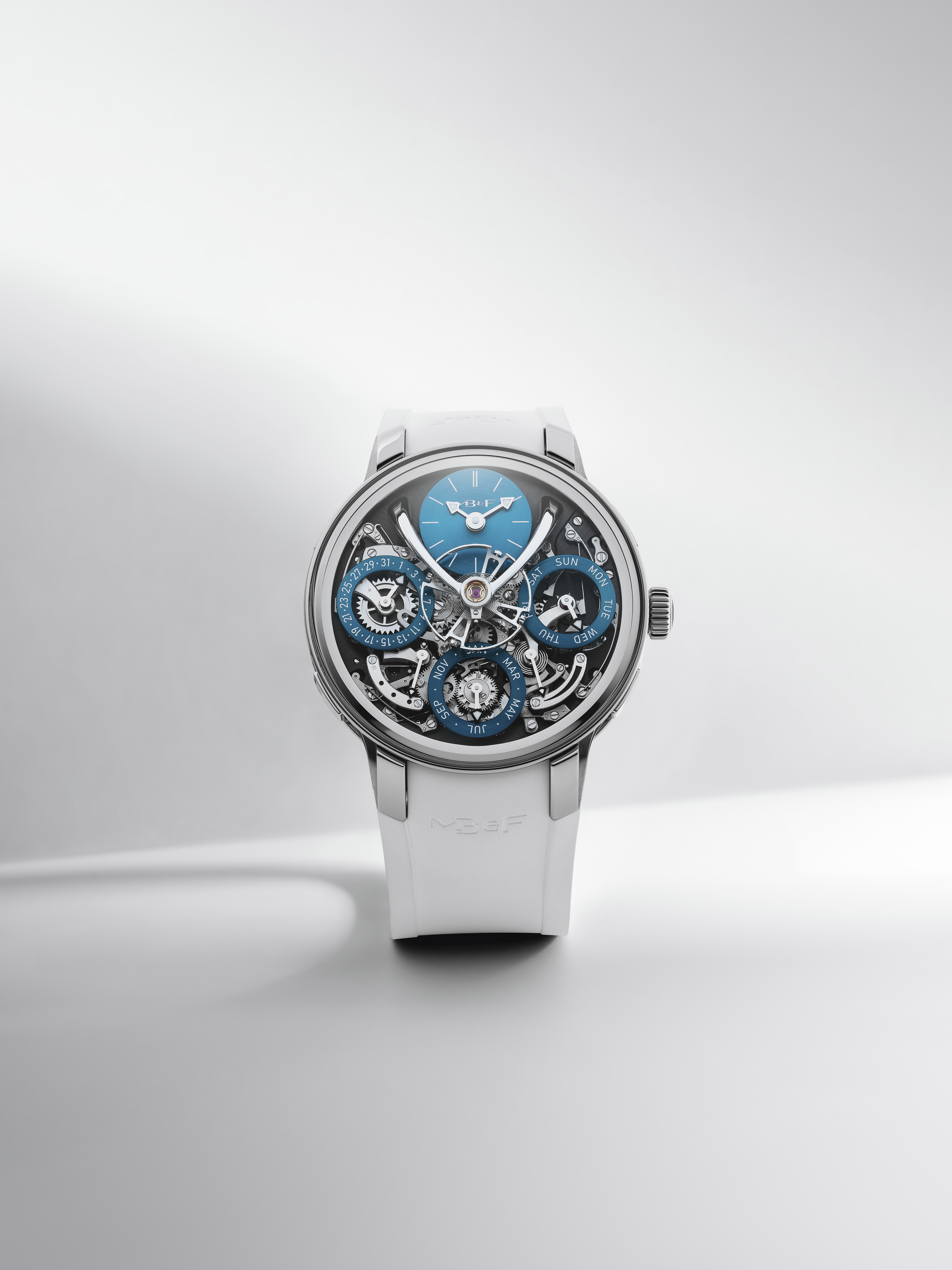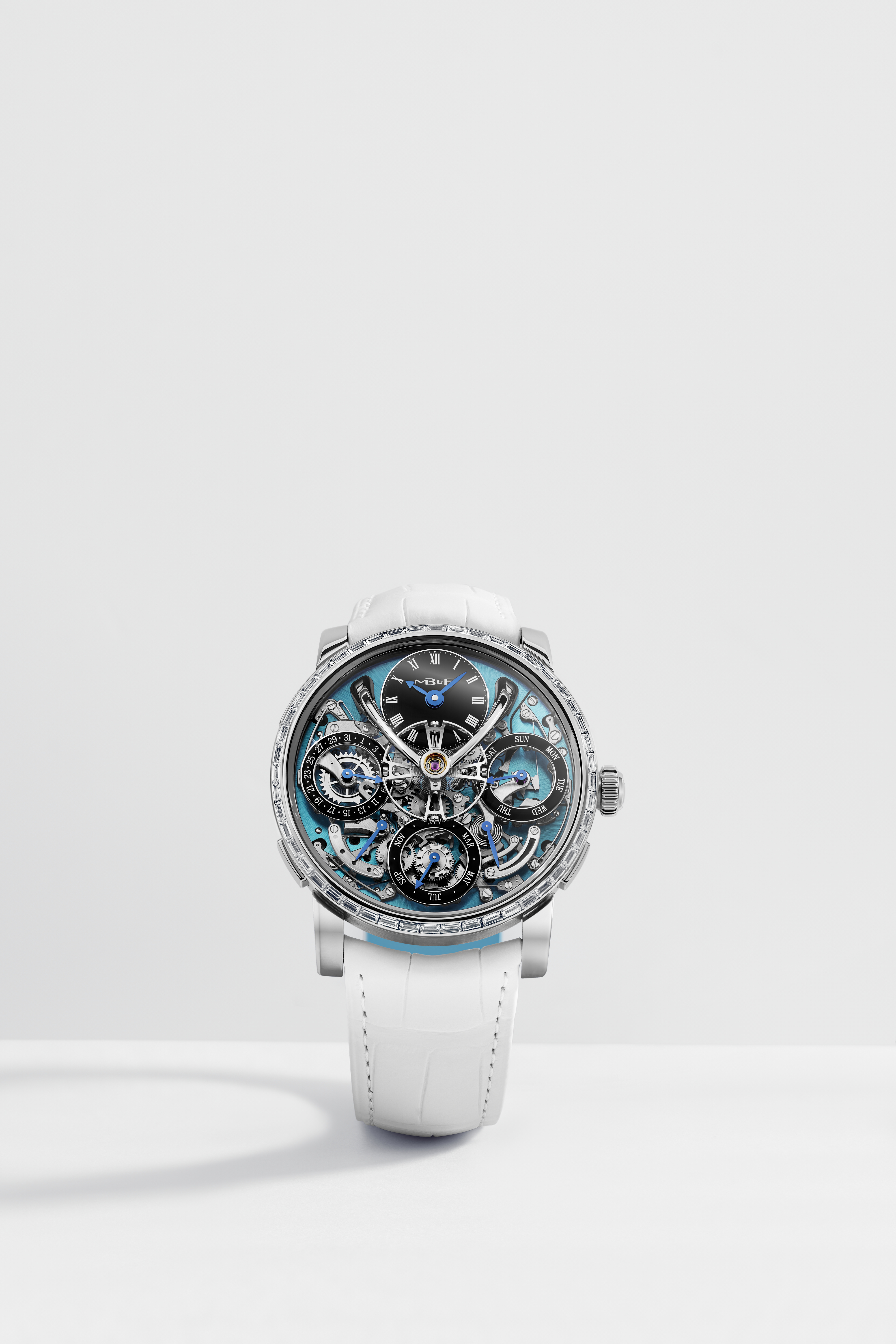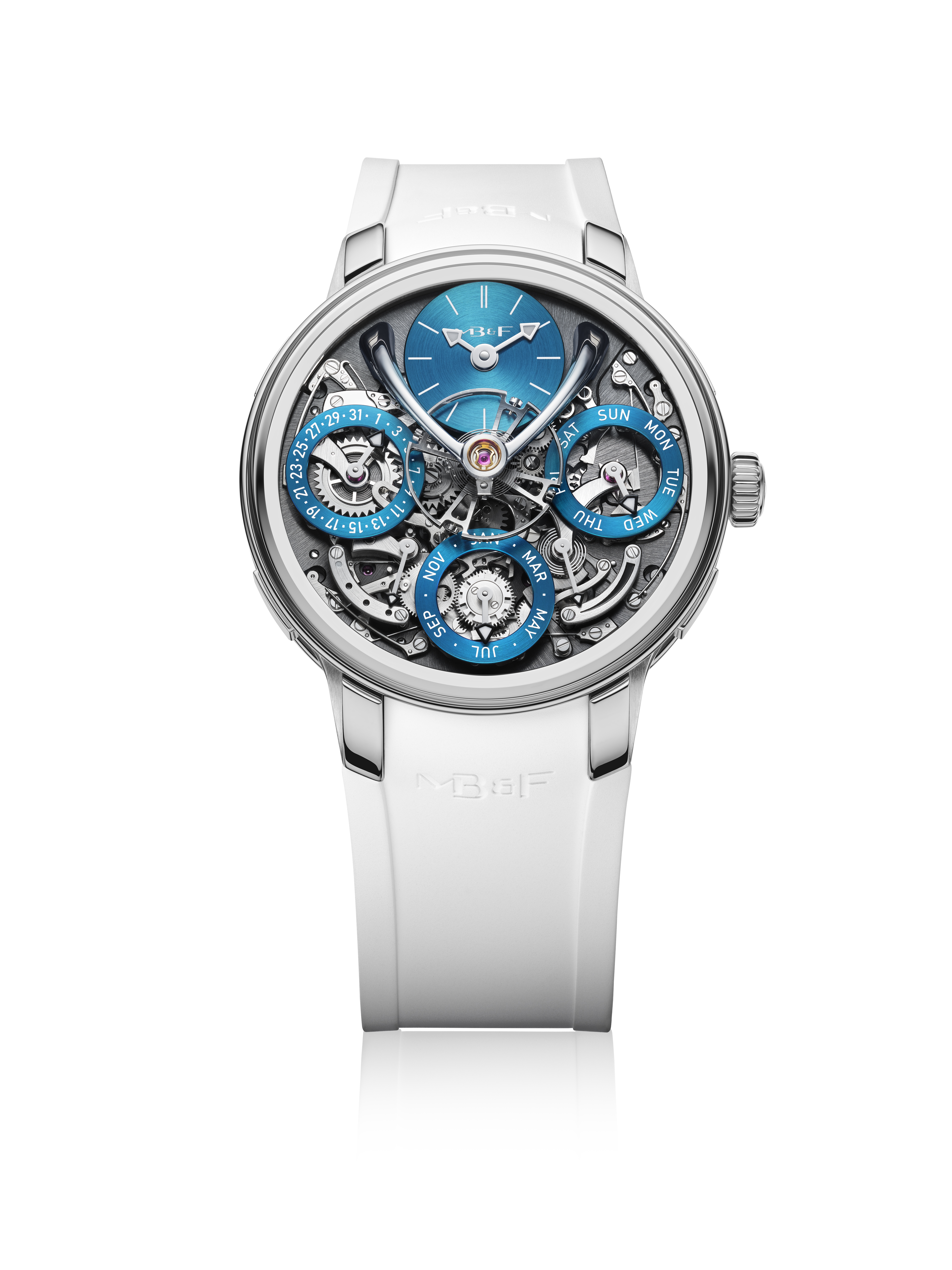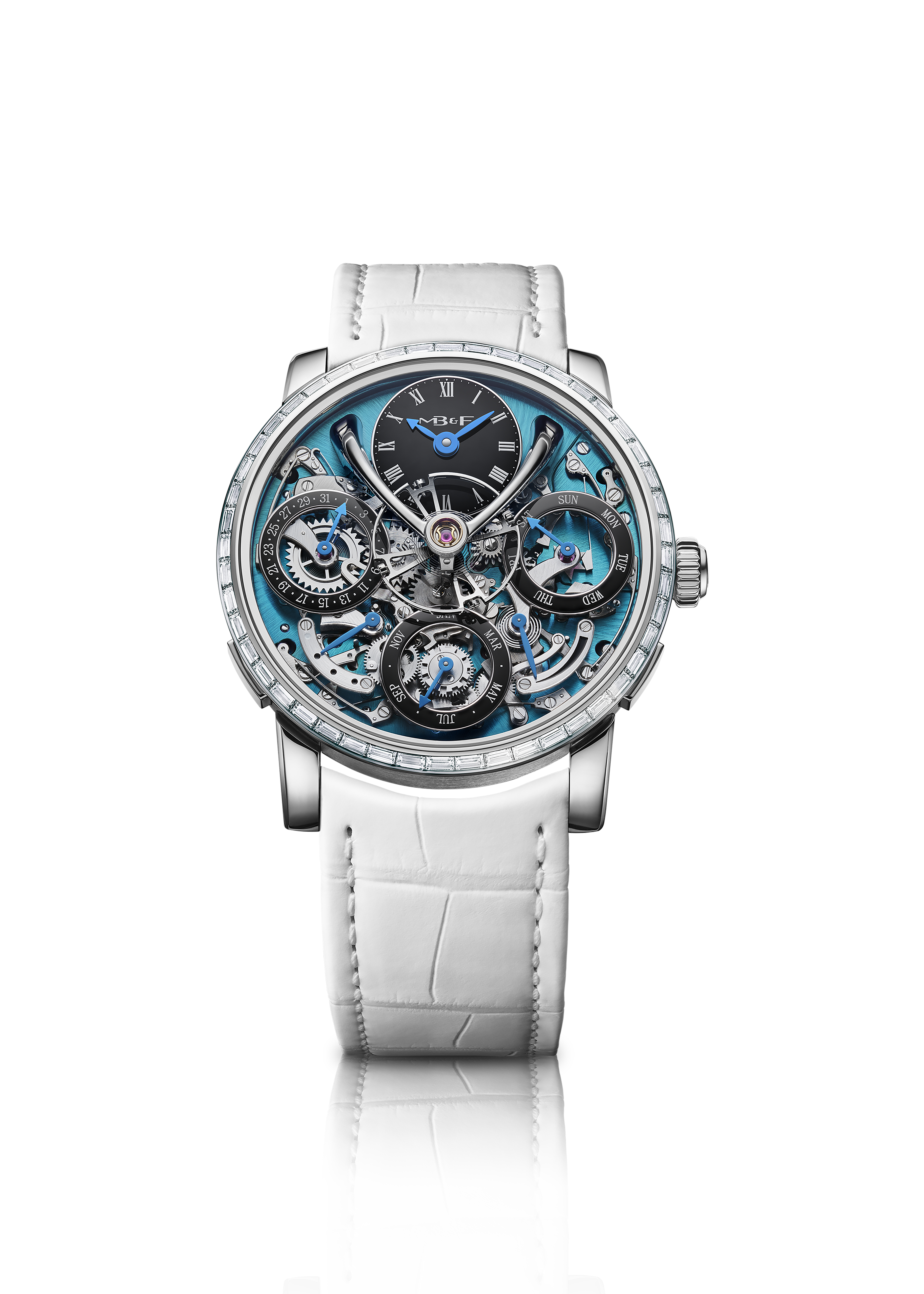 To commemorate this important milestone, the two partners have chosen to craft not just one but two Limited Editions, both powered by MB&F’s award-winning Perpetual Calendar calibre: 7 LM Perpetual EVO pieces and 5 LM Perpetual Baguette Diamonds pieces, both featuring signature blue highlights.